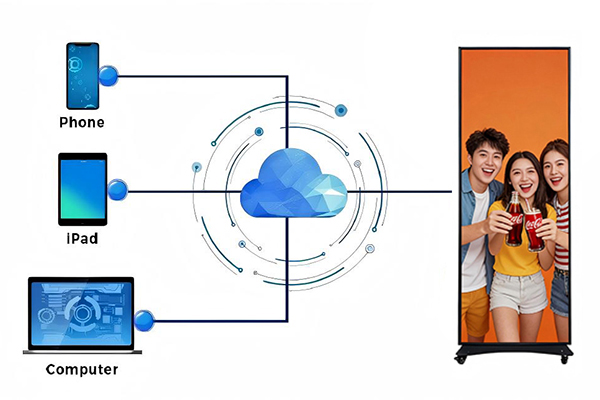 LED screen content can be updated and played in real-time from an iPad, mobile phone, PC, or laptop, with multiplatform publishing. It supports both USB and Wi-Fi connections and is compatible with iOS and Android devices.