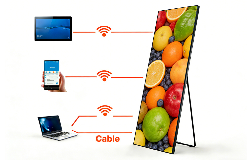 This LED Poster screen supports both synchronous and asynchronous control systems. Content can be updated in real-time and published across platforms via iPad, mobile phone, PC, or laptop, using either USB or Wi-Fi connection. It is fully compatible with both iOS and Android devices for operation and also features a built-in media player for standalone content storage and playback.