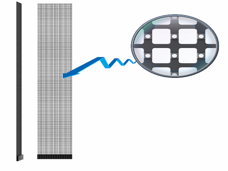 Pequeños diodos LED están incrustados en un patrón de cuadrícula sobre este sustrato transparente.